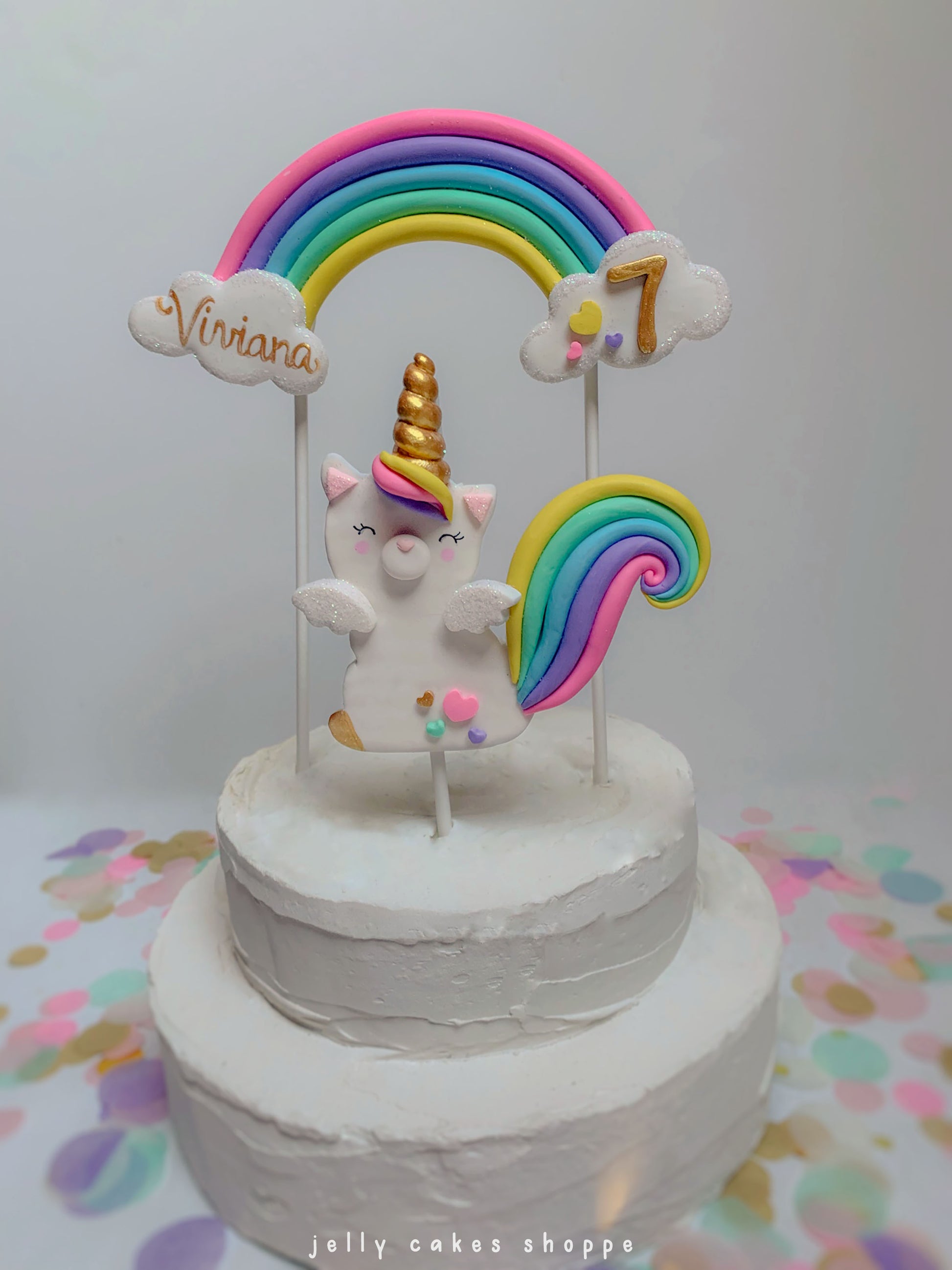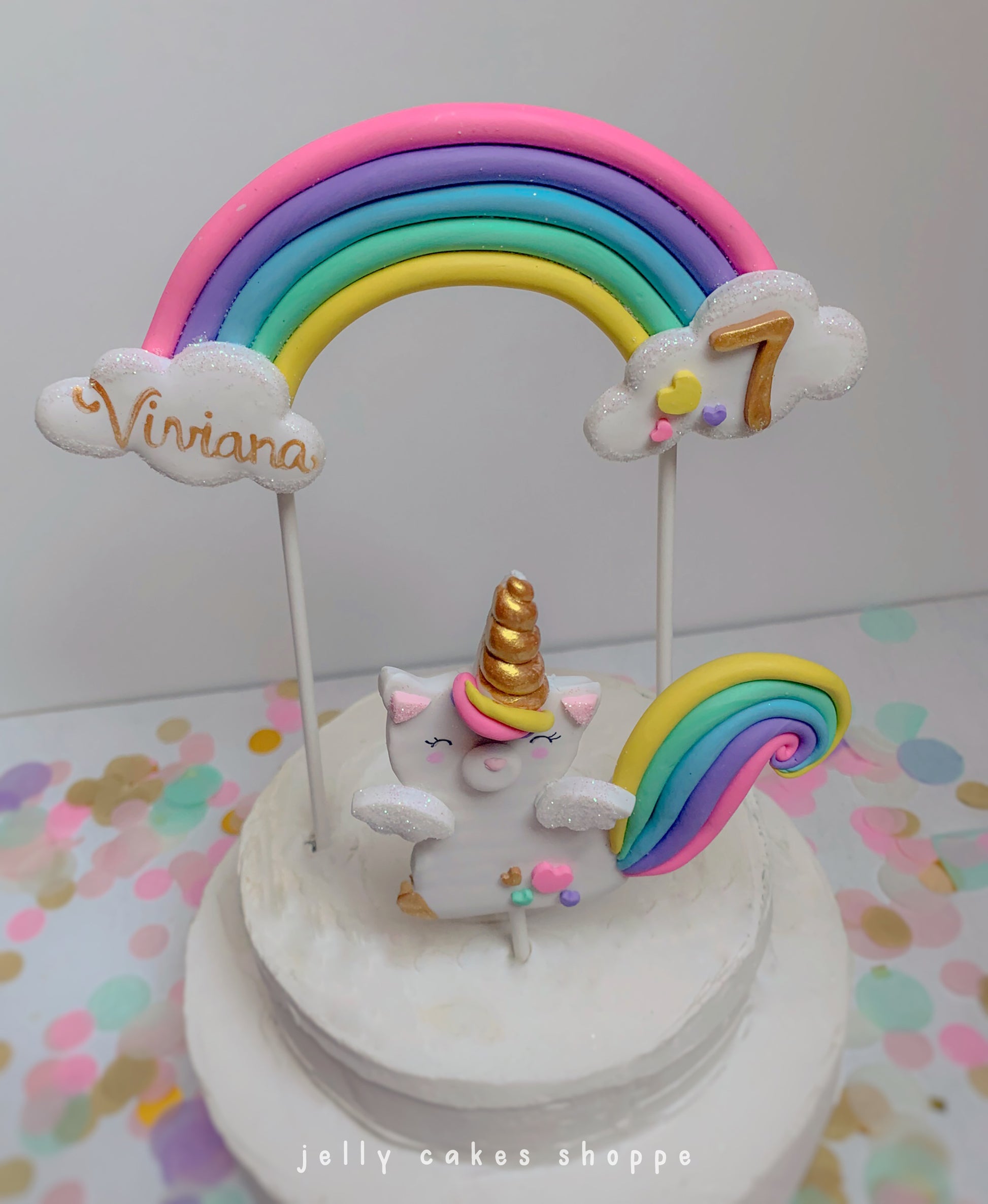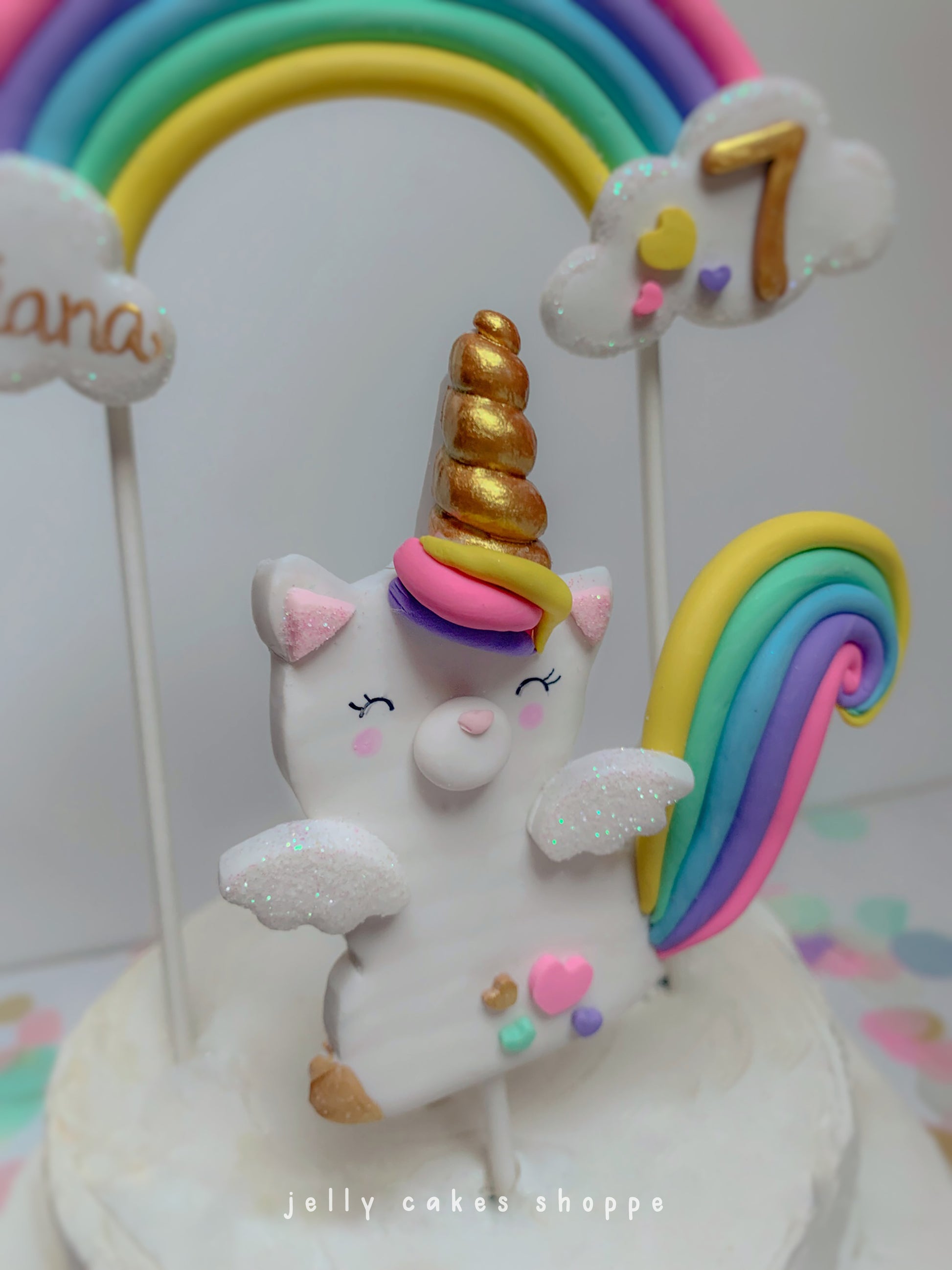♥ This cute Kittycorn and rainbow cake topper set in bright rainbow colors comes personalized with your child's name and age and makes the perfect addition to Meowgical birthday parties. The set includes 2 pieces (kittycorn and rainbow) It has been sculpted from non-edible polymer clay which lasts indefinitely so it can be saved as a special keepsake after the party. The unicorn also makes a cute centerpiece for tables. ♥