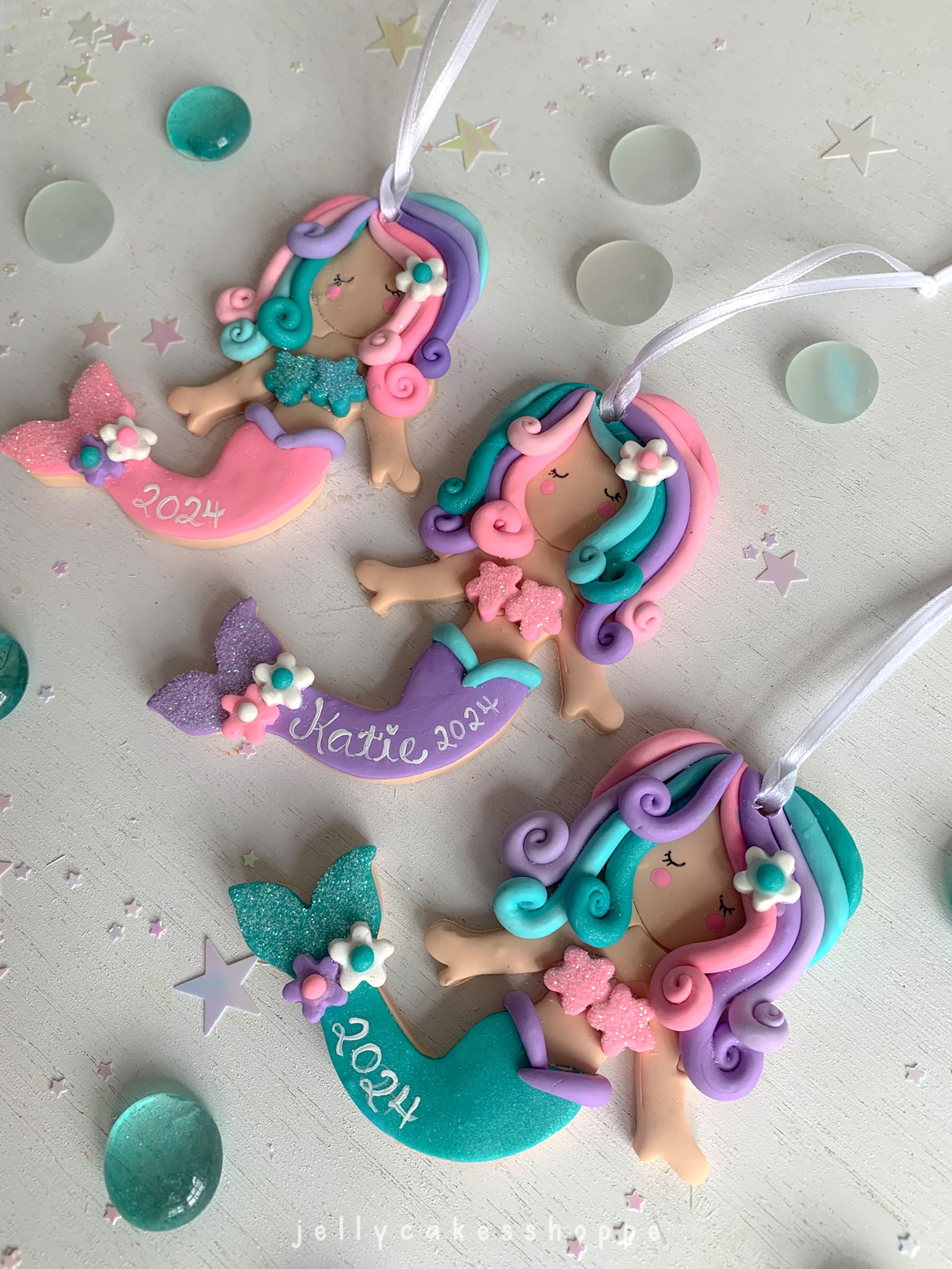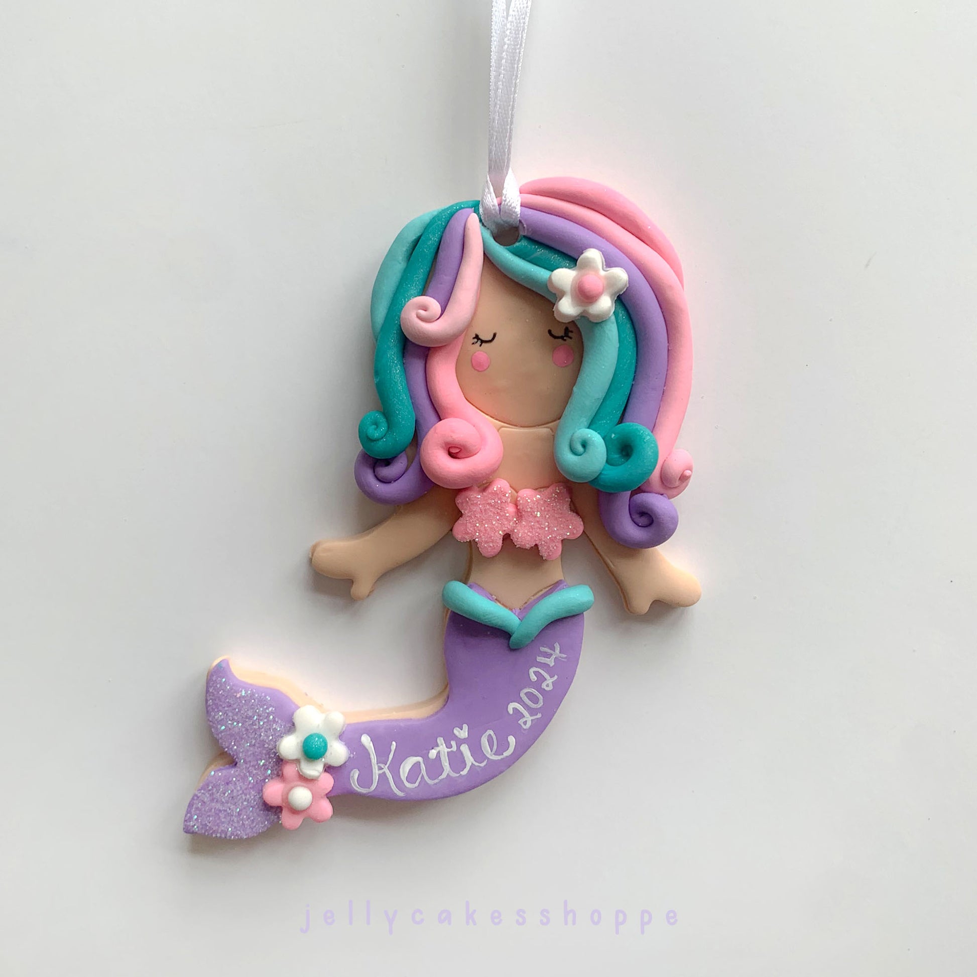 ♥ This sweet mermaid ornament has been handcrafted from polymer clay and is available in 3 colors as well as custom colors. She can be personalized with a name and date and will make a lovely keepsake gift for the little (or big) mermaid on your gift list.