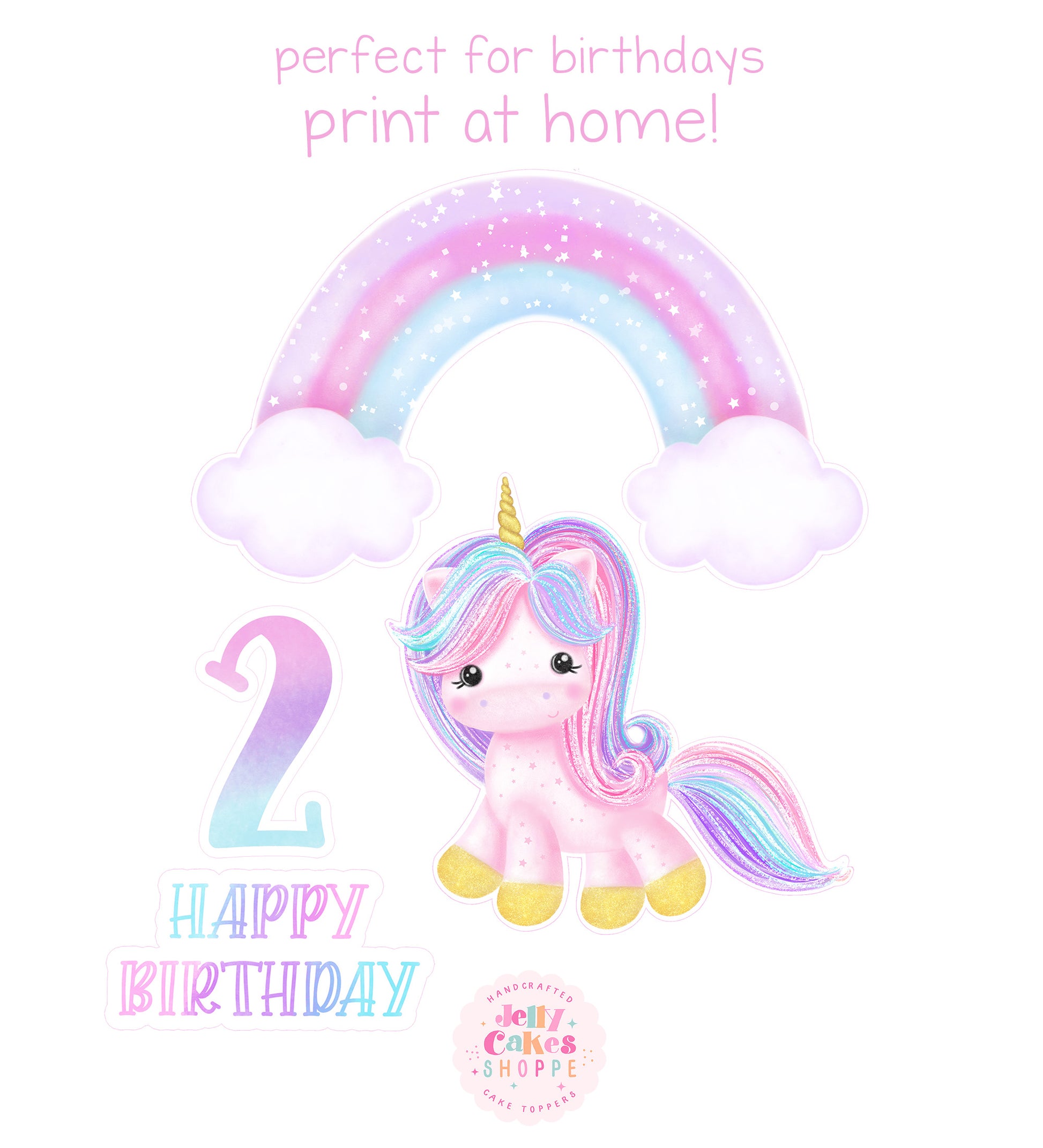 This printable pastel rainbow unicorn cake topper set makes a super cute addition to unicorn or rainbow themed birthday parties. It is a digital product and will be available to download as soon as payment clears. The download includes 1 PDF containing 1 8.5X11" 2 printable sheets with the unicorn, rainbow, Happy Birthday and one set of rainbow numbers. It also includes 1 printable instruction sheet. This is a printable set that you can download to your computer and print at home. It is a wonderful option for DIY parties...inexpensive, easy, quick and cute!