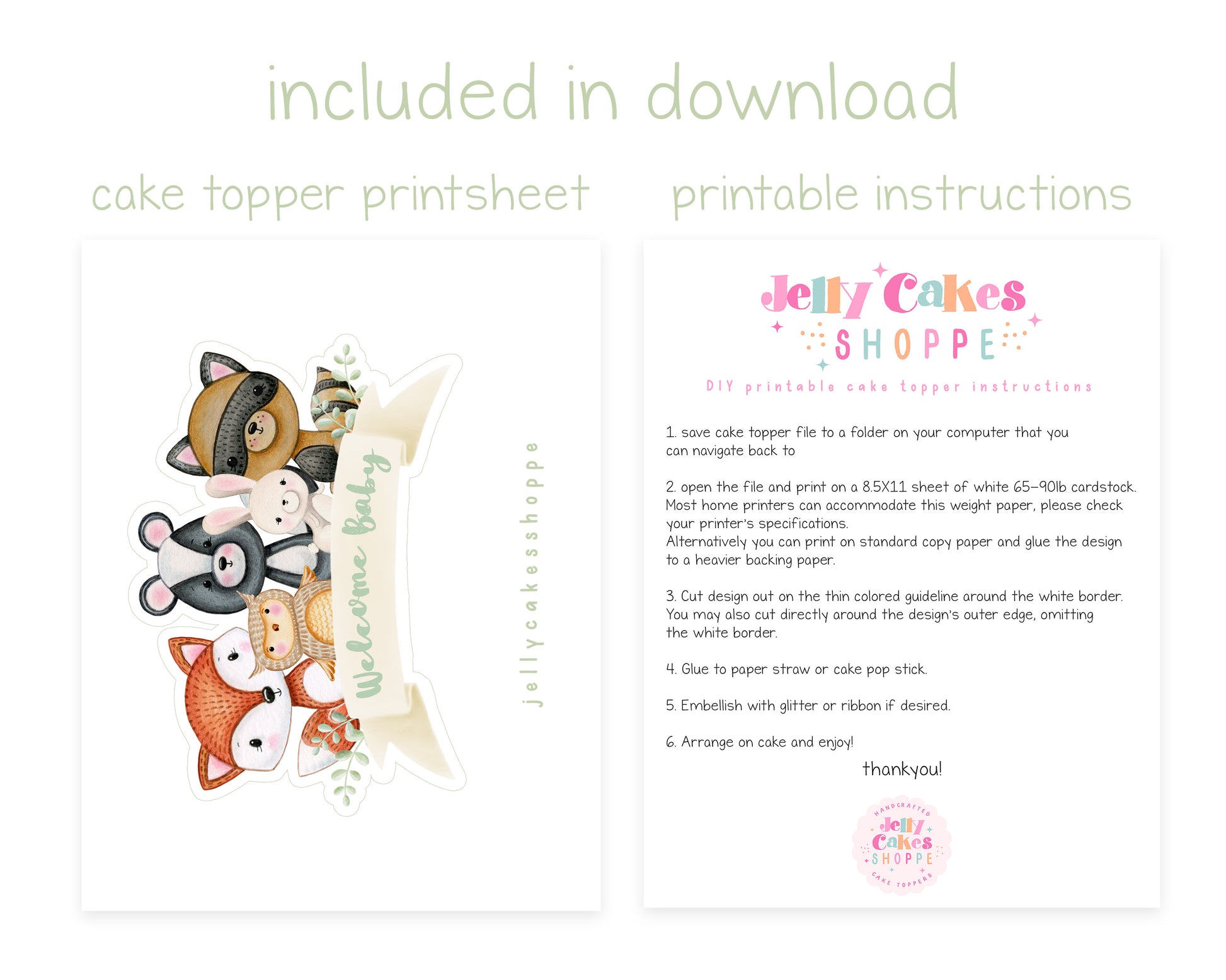 ♥ printable file includes 1 woodland animals topper with a beige banner with the sentiment "Welcome Baby" It is approximately 9" wide by 6" tall and can be adhered to cake pop sticks, paper straws or toothpicks to sit atop your cake.