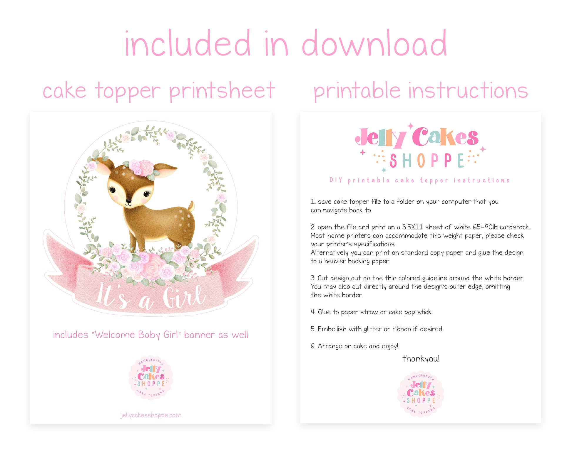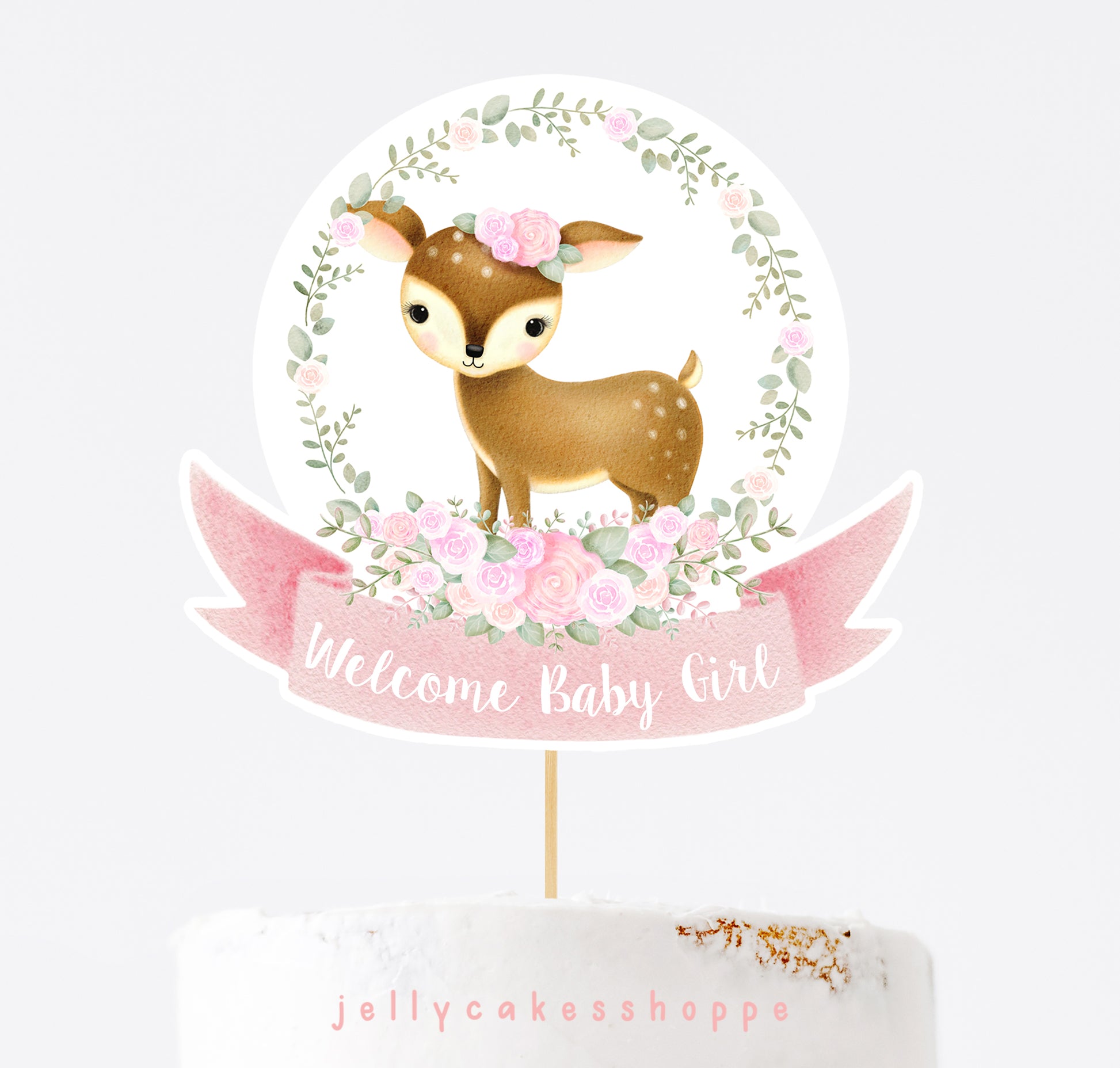 ♥ printable files includes sweet deer with a floral wreath and pink banner. It is approximately 7" wide and can be adhered to cake pop sticks, paper straws or toothpicks to sit atop your cake.