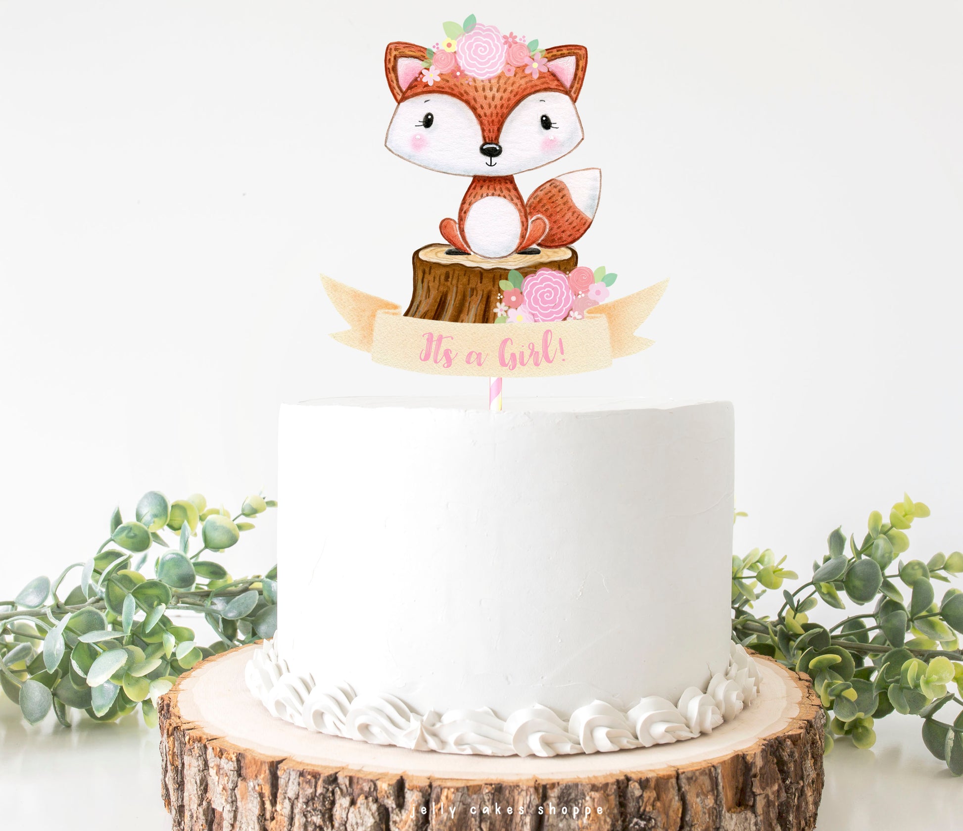 ♥ this topper features a cute fox and woodland stump with a banner that can be personalized with baby's name or sentiment (see 3rd photo for options). The original artwork was painted in watercolors by me and digitized to print beautifully on heavy weight cardstock.